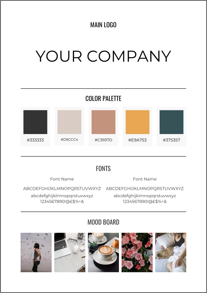 Includes a PDF with color palette details and font suggestions. All of your branding specifications in one place for streamlined design and consistency as you continue to grow your business. (Sample Brand Usage Guide below)